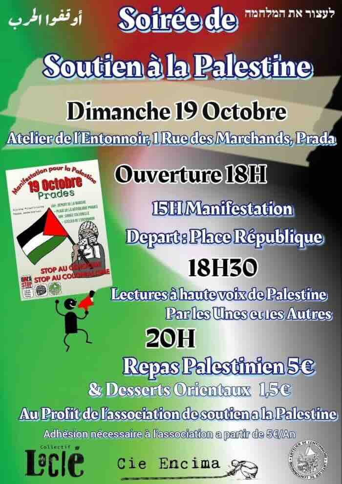 - 18h : Soirée Palestine à L’Entonnoir (1, rue des Marchands), avec lecture de poèmes et musique palestiniennes - suivies d’un repas palestinien